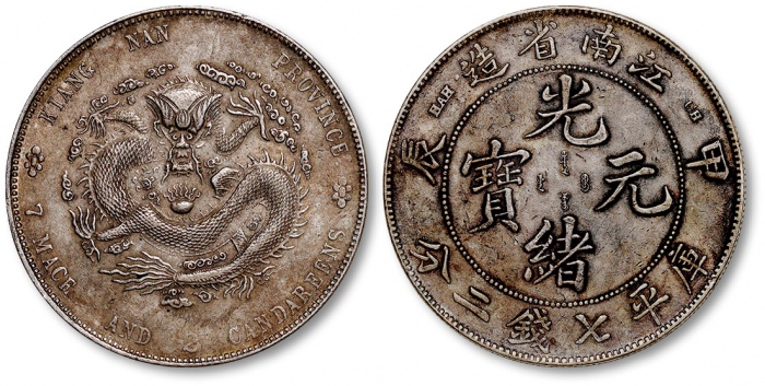清江南省造“甲辰”光绪元宝库平七钱二分银币一枚,打制规范清晰,龙鳞基本完整,细节较清晰,灰色老包浆,底光柔亮,近未使用品