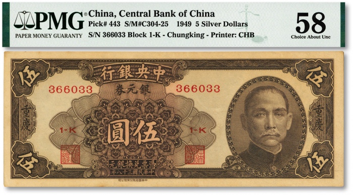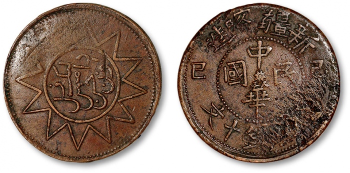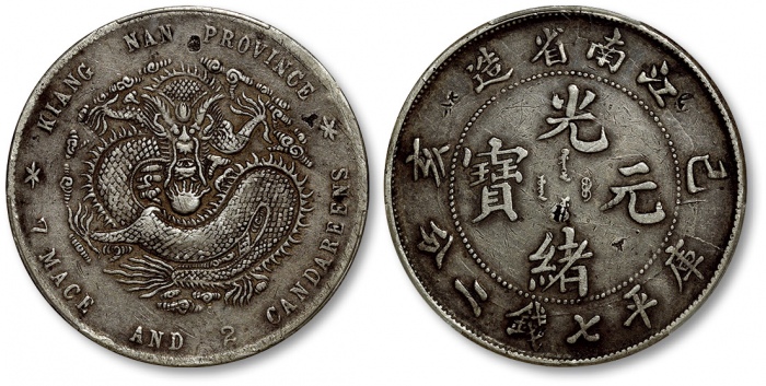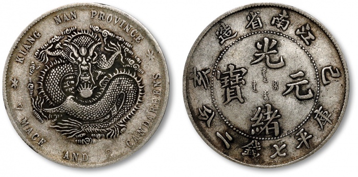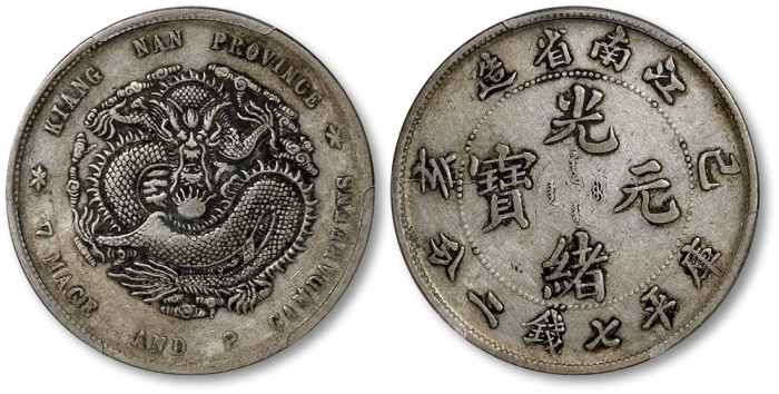 新疆阿城光緒銀圓伍錢銀幣。阿克蘇造幣廠。必定惊艷四座的一枚,新疆钱币中当之无愧的珍品。PCGS评鑑中与另一枚并列最高分,仅有轻微磨损,呈亮丽绸缎光泽。虽有一丝弱打,但较此版其他币强烈,定激起在拍卖场上的一番龙争虎斗。(t) CHINA. Sinkiang. 5 Mace (Miscals), AH 1311 (1894). Aksu Mint. Kuang-hsu (Guangxu). PCGS AU-58.L&M-785; K-1190; KM-Y-15; WS-1264. All collectors of the Sinkiang series of coinage should be immediately thrilled by this example, as it provides a quality that is of the utmost RARITY for Sinkiang issues. Tied with one other example for the finest certified specimen by PCGS, this minor displays very little evidence of technical wear and a bright and satiny luster. Though displaying a touch of strike weakness, the design elements are more fully placed than the norm for this type. A tremendous example that should excite any specialist in the series, or any generalist in Chinese coins simply looking for beautiful coins.
