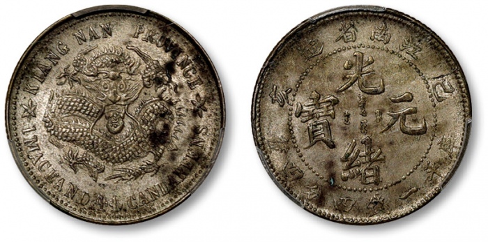 清江南省造“己亥”光绪元宝库平一钱四分四厘银币一枚,卡通龙,打制深峻,龙图饱满清晰,原味包浆带底光,状态品相极佳,金盾PCGS AU Detail(44223272)