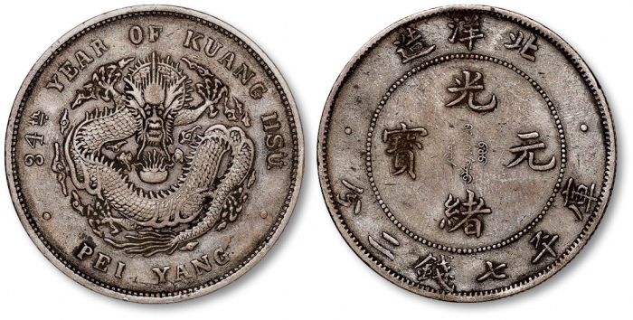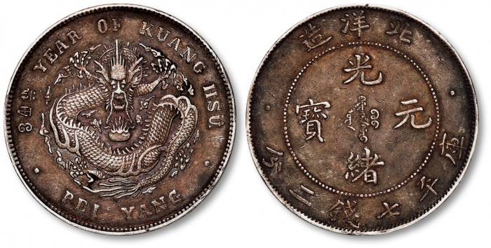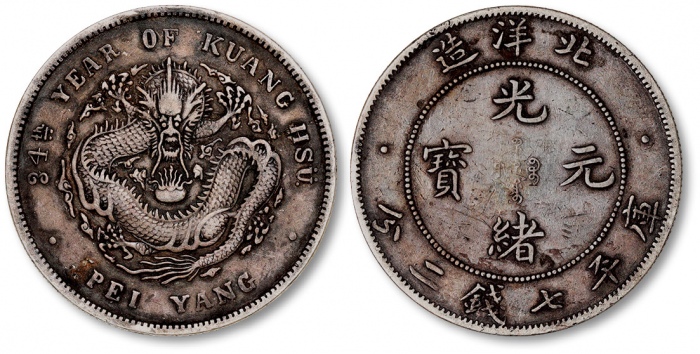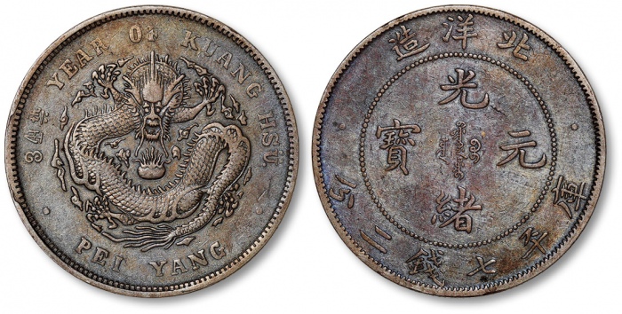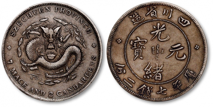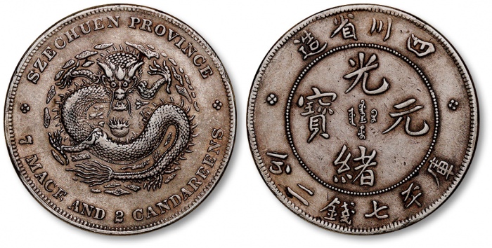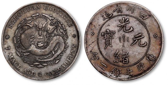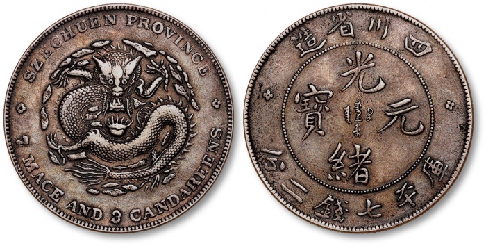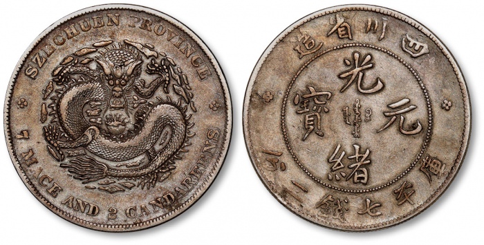 四川省造光緒元寶七錢二分銀幣。窄脸龙。 虽经流通及清洗,致币面呈现些许不自然的光感,但细节仍完整,整体诱人,性价比之选。(t) CHINA. Szechuan. 7 Mace 2 Candareens (Dollar), ND (1901-08). Chengdu Mint. Kuang-hsu (Guangxu). PCGS Genuine--Cleaned, EF Details.L&M-345; K-145; KM-Y-238.1; WS-0735. Variety with narrow-faced dragon. Though circulated and cleaned, this example retains much in the way of details and rather attractive surfaces, despite their unnatural brightness. A more affordable example of this popular "Dragon" Dollar type.