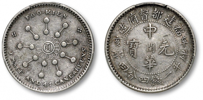 民国福建都督府造辛亥中心“闽”中华元宝库平一钱四分四厘银币一枚,整体清晰,灰色老包浆,状态自然,金盾PCGS XF45(88102344)