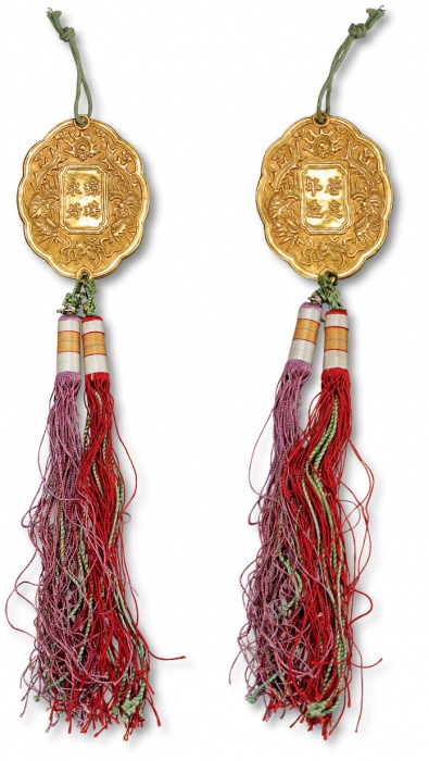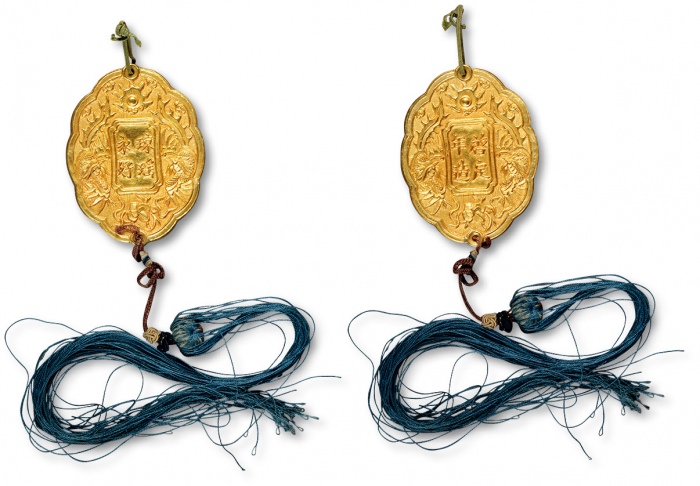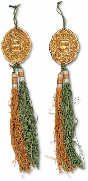 安南金佩“琼瑶永好”背“启定年造”牌饰一枚,重:17g,纯手工制作,四周以双凤、天书及火珠图案装饰,其中,启定年号使用为1916年至1925年。佩,于1889年开始颁发,专门用以奖赏具有高尚美德的女性,作为安南阮朝时期皇家赏赐之物非常罕见,北京珠博 美82(00027966) ...