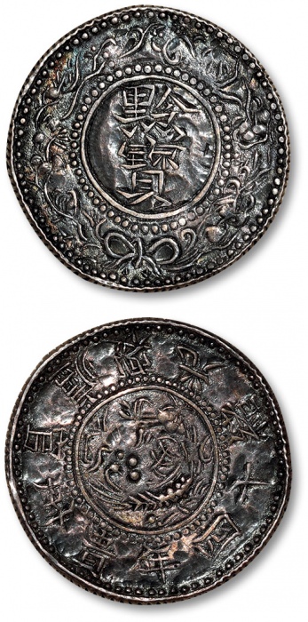 清光绪十四年(1888)贵州官炉造黔宝半两银币一枚,齿边,五彩老包浆,光泽绚丽,刀工自然流畅,制作精整规范,此币较十六年黔宝更为少见,乃中国银币之名誉品,源自黔北藏家旧藏,极为难得,极美品 ...