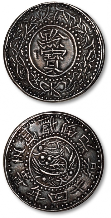 清光绪十四年(1888)贵州官炉造黔宝半两银币一枚,光边,五彩老包浆,光泽绚丽,刀工自然流畅,制作精整规范,此币较十六年黔宝更为少见,乃中国银币之名誉品,源自黔北藏家旧藏,极为难得,极美品 ...