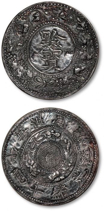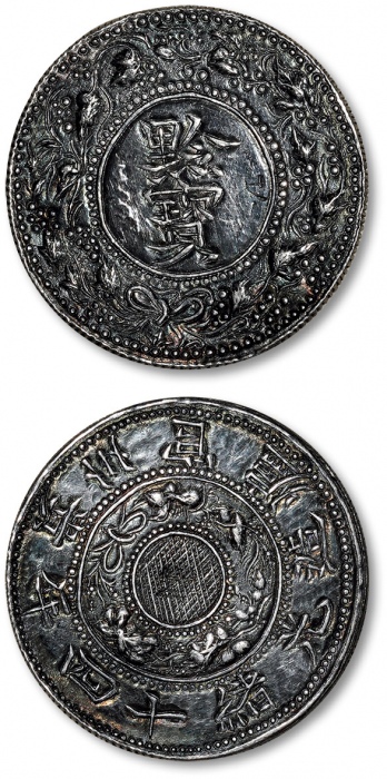 清光绪十四年(1888)贵州官炉造黔宝壹两银币一枚,齿边,五彩老包浆,光泽绚丽,刀工自然流畅,制作精整规范,此币较十六年黔宝更为少见,乃中国银币之名誉品,源自黔北藏家旧藏,极为难得,极美品 ...