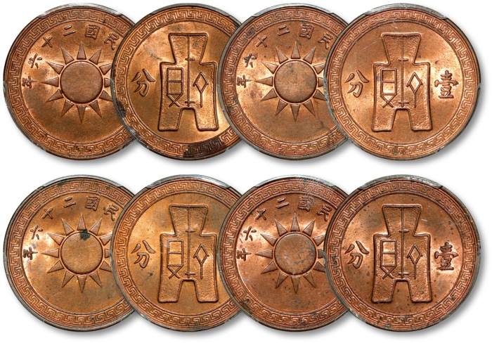 民国二十六年党徽背布图壹分铜元共四枚,打制极为规范,立体清晰,底版平滑光洁,灰色包浆,底光闪亮,状态上佳,分别为金盾PCGS MS63RB、MS64RB(42309476、42309479、42309480、42309483)