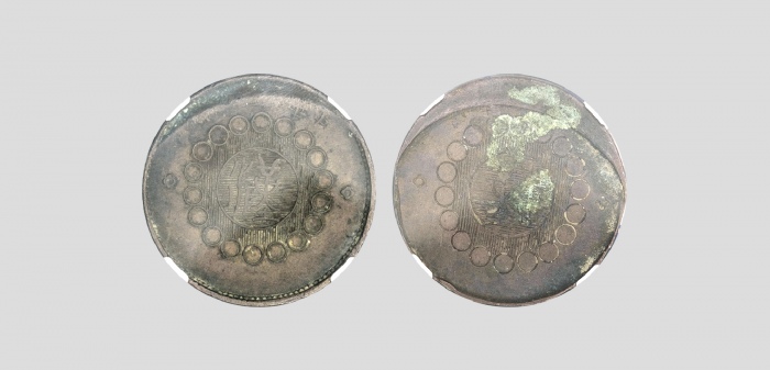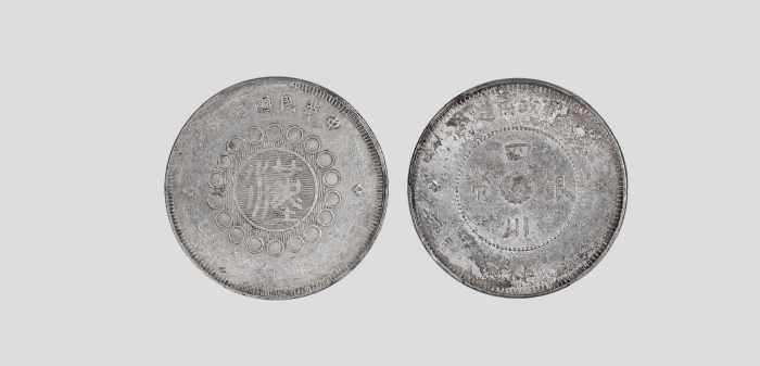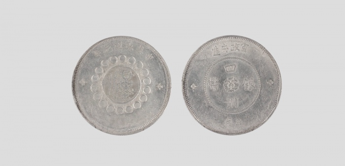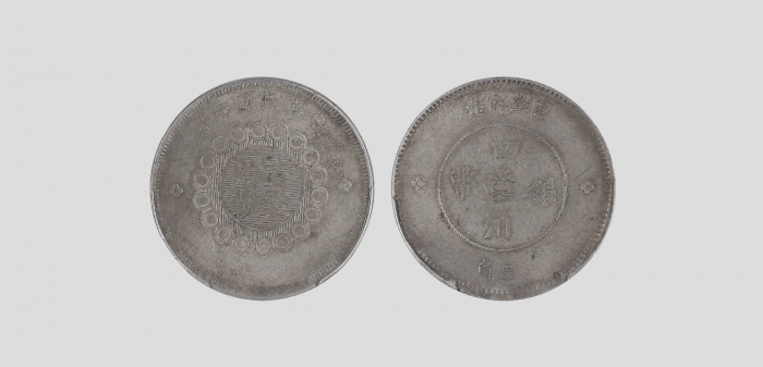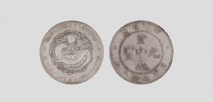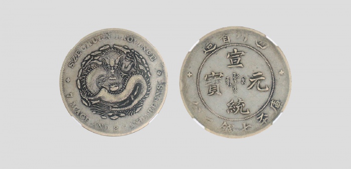 四川省造光緒元寶三錢六分銀幣。窄面龙。存世品中无甚瑕疵,细节依然完整,虽有些许流通痕跡但不甚明显。铁灰色包浆,底光犹存。令人印象深刻的一枚省造发行。(t) CHINA. Szechuan. 3 Mace 6 Candareens (50 Cents), ND (1901-08). Chengdu Mint. Kuang-hsu (Guangxu). PCGS VF-25.L&M-347; K-146; KM-Y-237.2; WS-0741. Variety with narrow-faced dragon. A problem free survivor, this 50 Cent issue of Szechuan delivers strong remaining details, despite some evidence of circulation. The surfaces are steely gray, with some brilliance yet remaining. An impressive and wholesome piece for the dedicated specialist in provincial coinage.