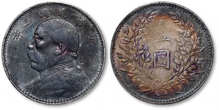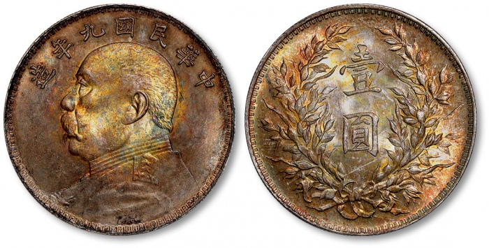 民国九年袁世凯像壹圆银币一枚,精发,此币打制清晰深峻,人像生动传神,正宗原味上海老弄堂五彩包浆,色泽斑斓,状态极佳,金盾NGC AU58(6403781-004)