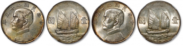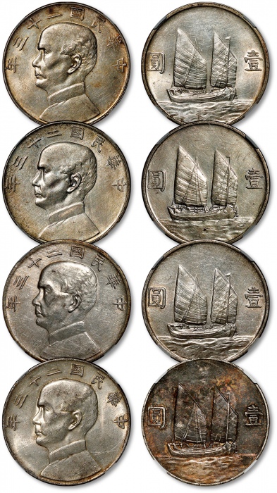 民国二十三年孙中山像背帆船壹圆银币共四枚,打制规范,金色包浆,底光柔亮,状态自然,均为NGC UNC Detail(6174675-001、6174675-007、6174675-013、6174675-016)