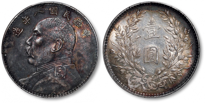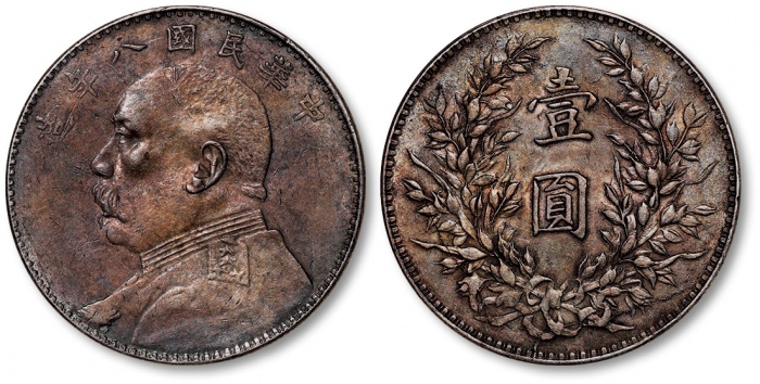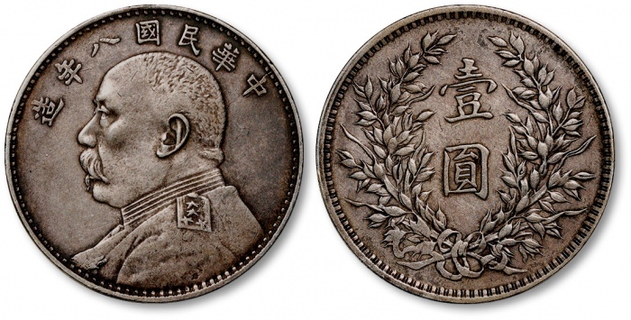 民国八年袁世凯像壹圆银币一枚,打制规范清晰,厚重深灰色老包浆,带底光,近未使用品
