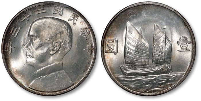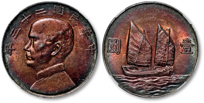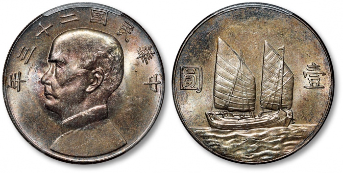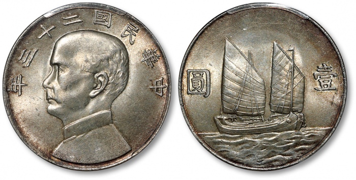 民国二十三年孙中山像背帆船壹圆银币一枚,打制规范,清晰立体,底版平滑,环形五彩老包浆,旋转底光,丝滑柔亮,状态上佳,金盾PCGS MS63(37946233)