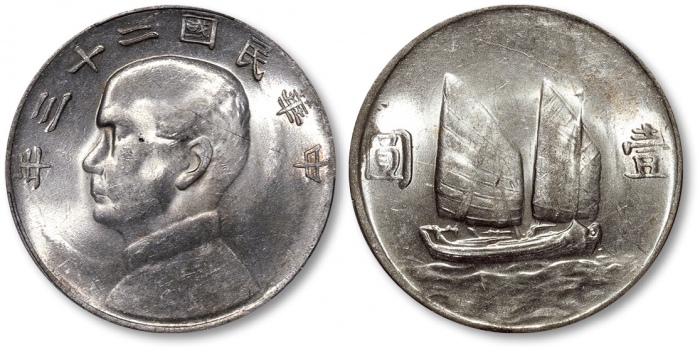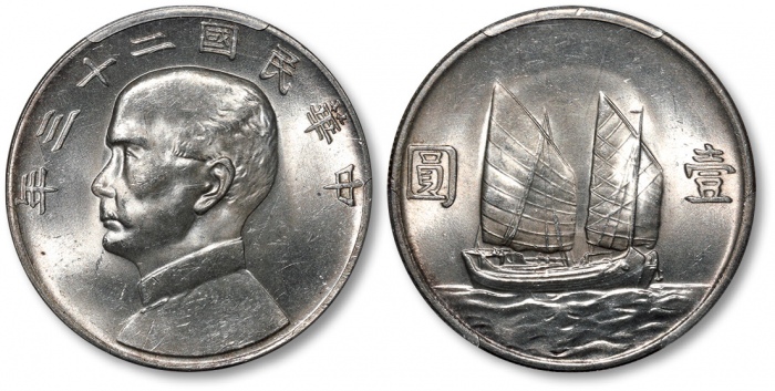 民国二十三年孙中山像背帆船壹圆银币一枚,打制规范利落,图案立体挺拔,浮雕感强烈,镜面底版,十分平整,铸纹清晰,银光霜白闪亮,状态极佳,十分难得,金盾PCGS MS62(84478035)