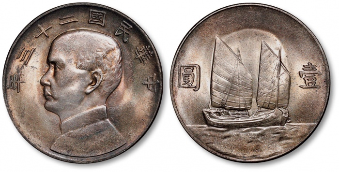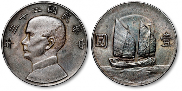 民国二十三年孙中山像背帆船壹圆银币一枚,打制规范清晰,深灰色淡彩包浆,带底光,近未使用品