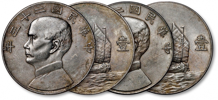 民国二十三年孙中山像背帆船壹圆银币共两枚,打制规范清晰,底版平整,均匀深灰色包浆,近未使用品