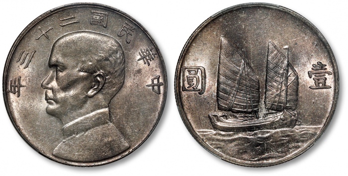 民国二十三年孙中山像背帆船壹圆银币一枚,云南版,打制清晰,薄纱包浆,旋转闪亮银光,金盾PCGS MS61(88112109)