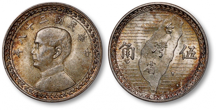 民国三十八年孙中山像背台湾省地图伍角银币一枚,打制规范,深黄油彩包浆,底光旋转柔亮,近未至完全未使用品