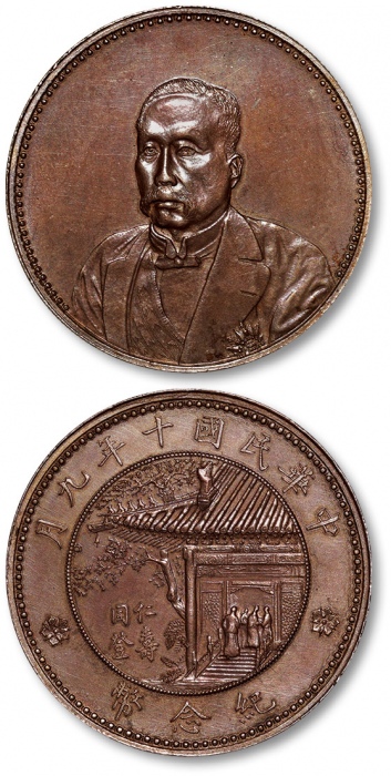 民国十年九月徐世昌“仁寿同登”纪念币一枚,此币打制深骏,币边高挺,文字立体清晰,人物刻画生动传神,浮雕感强烈,镜面底板,均匀深酱彩包浆,状态自然,品相上佳,完全未使用品