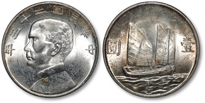 民国二十三年孙中山像背帆船壹圆银币一枚,打制规范,清晰立体,底版平整,原色旋转银光,丝滑柔亮,状态上佳,金盾PCGS MS63(82723875)