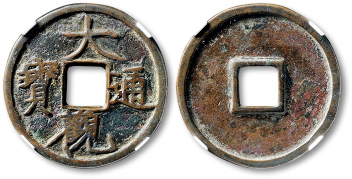 “大观通宝”折十型一枚,直径:41.5mm,厚:3mm,公博评级美90