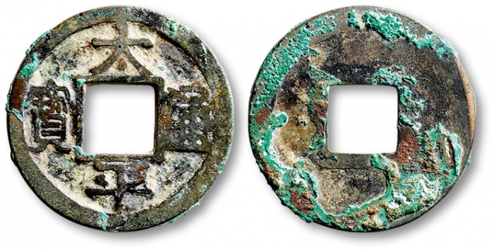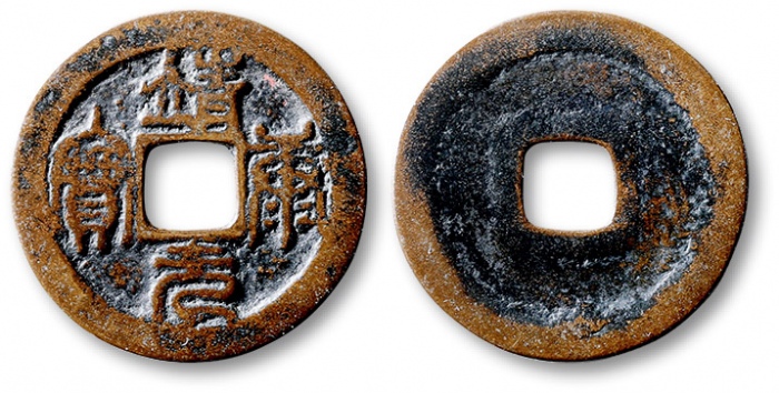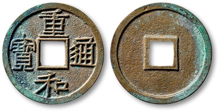 “重和通宝”一枚,直径:25.6mm,此钱铸造极为精美,铜质精良,笔画清晰爽利,工艺一流,品相万里挑一,极为难得,少见,极美品