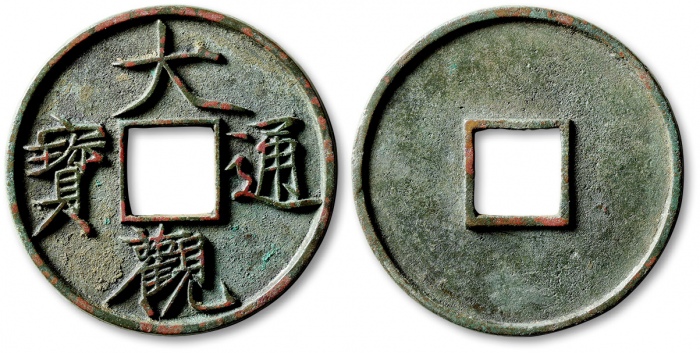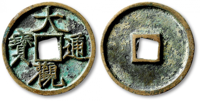 “大观通宝”折十型一枚,直径:41.3mm,厚:3mm,狭俯大版,公博评级美92