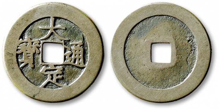 “大定通宝”折二一枚,少见,直径:29mm,此钱圆整,铜质银白,字口清晰立体,品相上佳