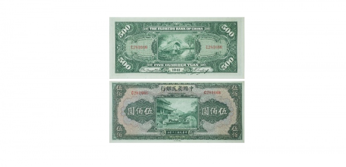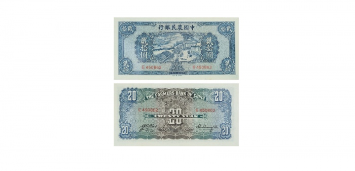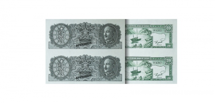 关于 民国二十六年中国农民银行贰角单面正反面样票一对,编号FE000000及DQ000000,控号6113 及3689,大业版,均AEF,曾黏贴,背面右下角有细孔,罕见印钞机构的评论