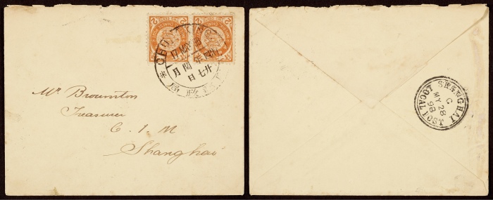 1898年四川重庆寄上海石印蟠龙封,倒贴石印蟠龙2分双连,销“重庆邮政局1898年3月17日(光绪廿四年闰月廿七日)”英汉大圆戳,落地背盖上海工部1898年3月28日双圈“C”型日戳,双戳清,封品完好<br><br>四川邮政史 10644-10765 ...