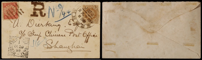 1898年四川重庆寄上海挂号西式封,贴石印蟠龙5分、4分各一枚,分销重庆八卦戳及重庆邮政局1898年10月17日大圆戳,另盖“R”挂号戳,落地盖上海书信馆1898年10月29日挂号到达戳,保存完好