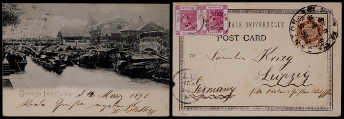 1898年广州寄德国明信片,正贴石印蟠龙4分一枚,销广州邮政局1898年3月15日英汉大圆戳,另贴香港2先时两枚,未盖IPO戳,经香港中转销香港3月16日小圆“A”型日戳,落地德国4月17日到达戳,背图为广州河岸停泊小船摄影图,片品上佳,早期广州极限片<br><br>广东邮政史 10815-1 ...