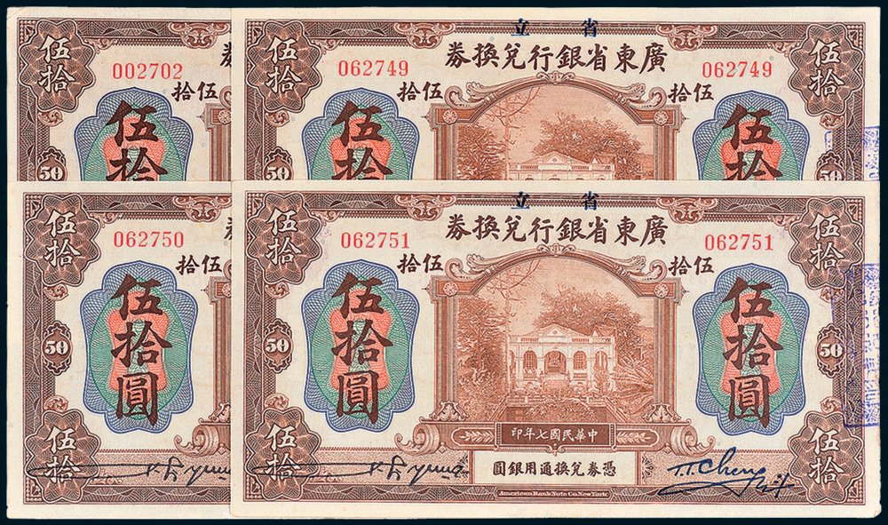 民国七年(1918年)省立广东省银行兑换券伍拾圆四枚,八五成至九成新