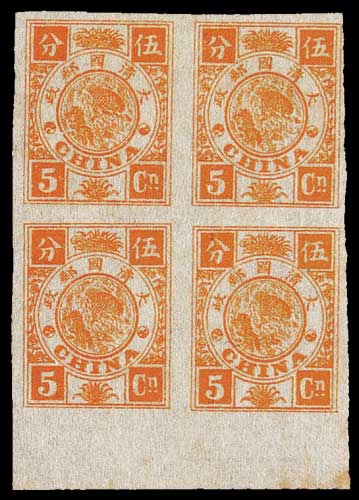 为加盖全版横四格之左数第一格:第十四枚“作”字左移、第四枚“暂”字、第六枚“清”字、第十五枚“银”字破损等固定版式特征,是研究加盖大字短距邮票版式之重要实物,此全格票颇为罕见,部分齿孔有断裂,数枚票有破损,泛黄,贴纸,中上品 ...