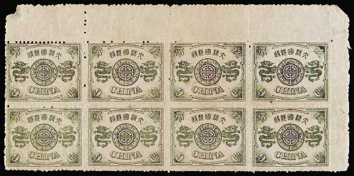 为加盖全版横四格之左数第一格:第十四枚“作”字左移、第四枚“暂”字、第六枚“清”字、第十五枚“银”字破损等固定版式特征,是研究加盖大字短距邮票版式之重要实物,此全格票颇为罕见,部分齿孔有断裂,数枚票有破损,泛黄,贴纸,中上品 ...
