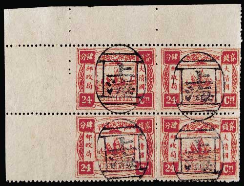 为加盖全版横四格之左数第一格:第十四枚“作”字左移、第四枚“暂”字、第六枚“清”字、第十五枚“银”字破损等固定版式特征,是研究加盖大字短距邮票版式之重要实物,此全格票颇为罕见,部分齿孔有断裂,数枚票有破损,泛黄,贴纸,中上品 ...