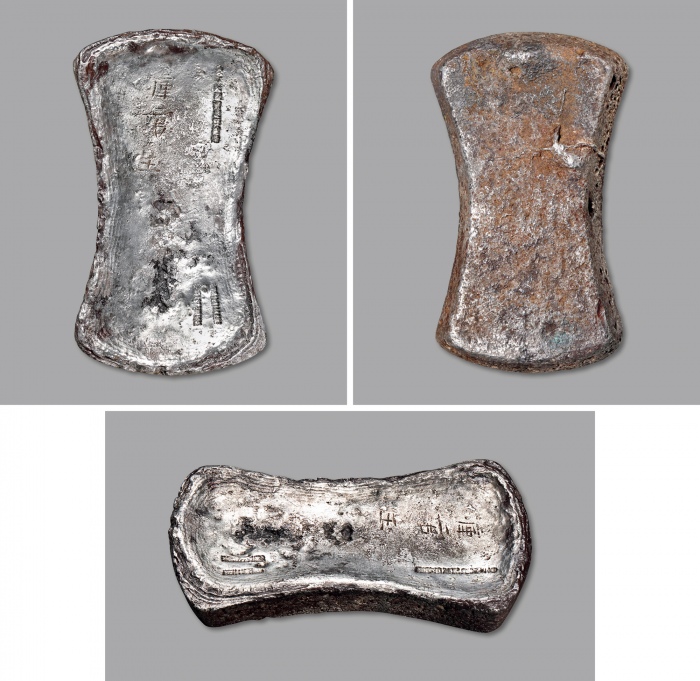 元“东平路·课银X·五十两·银匠王德·银匠崔聚·库官王”五十两银铤一枚,重:1966.8g,元代官铸五十两银铤存世甚少,国内外迄今共发现三十余枚,多为公立博物馆收藏,民间流传极罕,此铤系东平路课税所课征的税银,品种珍稀;拍品造型近似于南宋银铤,小幅度弧首束腰,狭长 ...