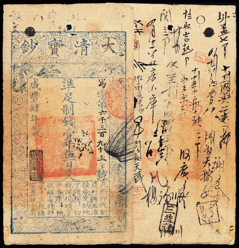 咸丰四年大清宝钞壹千伍百文一枚,写字第六千三百九十三号,背面墨书满写,流用频繁,八五成新