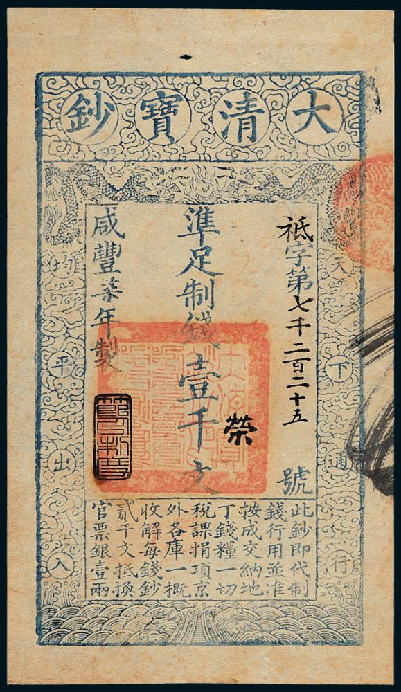 咸丰七年大清宝钞壹千文一枚,祗字第七千二百二十五号,有背书,九五成新