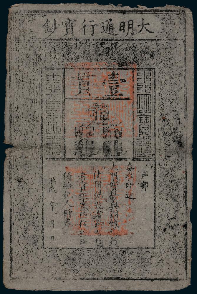 明洪武年间(1375-1398年)大明通行宝钞壹贯,PMG 20。大明通行宝钞发行于明洪武八年(1375年),面额有壹佰文、贰佰文、叁佰文、肆佰文、伍佰文和壹贯文六种面值,壹贯合铜钱壹仟文或白银壹两,肆贯合黄金壹两,洪武二十二年(1389年)加发拾文至伍拾文的小钞,在明朝二百多 ...