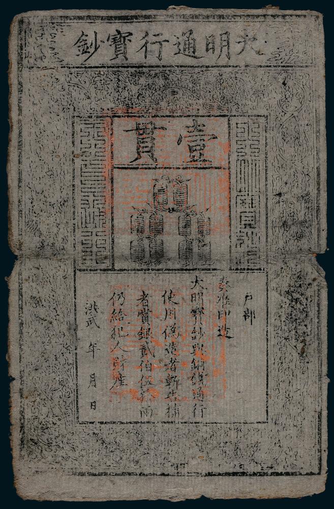 明洪武年间(1375-1398年)大明通行宝钞壹贯,PMG 20。大明通行宝钞发行于明洪武八年(1375年),面额有壹佰文、贰佰文、叁佰文、肆佰文、伍佰文和壹贯文六种面值,壹贯合铜钱壹仟文或白银壹两,肆贯合黄金壹两,洪武二十二年(1389年)加发拾文至伍拾文的小钞,在明朝二百多 ...