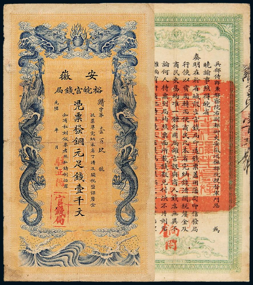 光绪年安徽裕皖官钱局制钱票壹千文一枚,正面加盖“驻正阳”及“官钱局”章,背盖“饷用”,极稀少,八成新