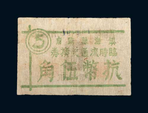 镇海县政府临时流通兑换券抗币伍角,八成新
