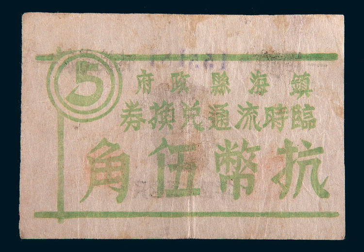 民国三十四年(1945年)镇海县政府临时流通兑换券抗币伍角,八成新