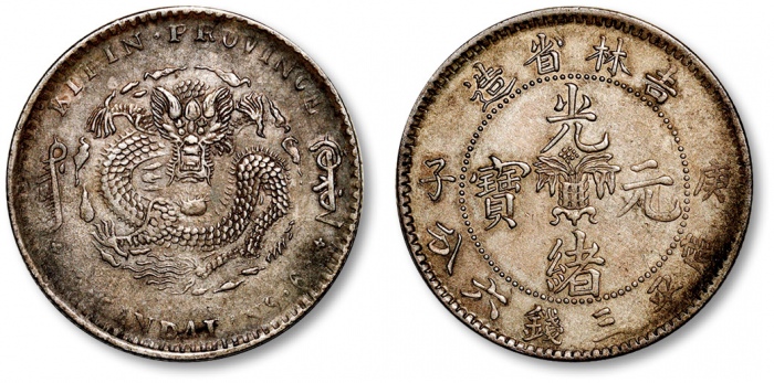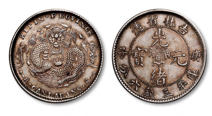 清吉林省造“庚子”光绪元宝库平三钱六分银币一枚,中心花篮,错英文版(KIPIN+双A双倒V),极少见,打制规范完整,龙鳞清晰,深灰色包浆,近未使用品