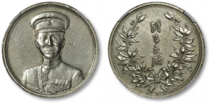 1936年张学良戎装像背花叶“张学良赠”银质纪念章一枚,打模极深,人像生动传神,图案挺拔立体,细节完美呈现,镜面精制,包浆自然原味,银光闪亮,十分精美,NGC XF Details(2776359-001)