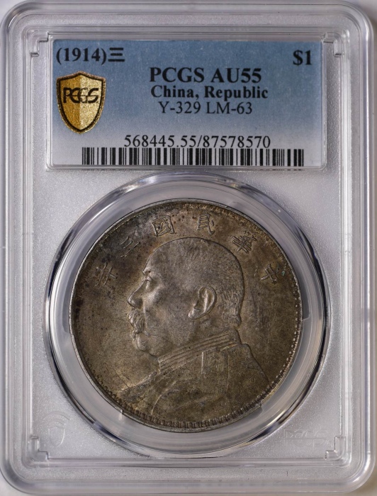 第200405号:1914年民国三年袁像银币壹圆 PCGS AU55,原味状态,深打带光,包浆浓郁,味道一流。 估价:2500--4000