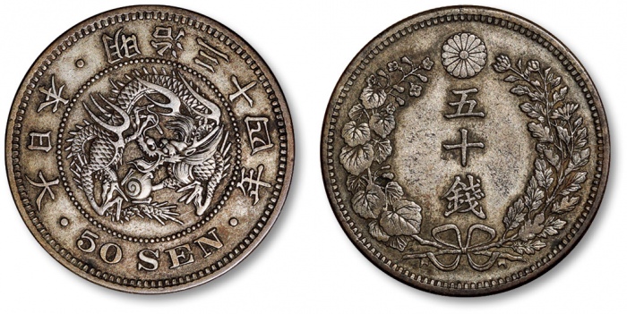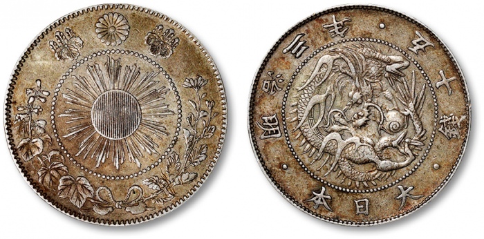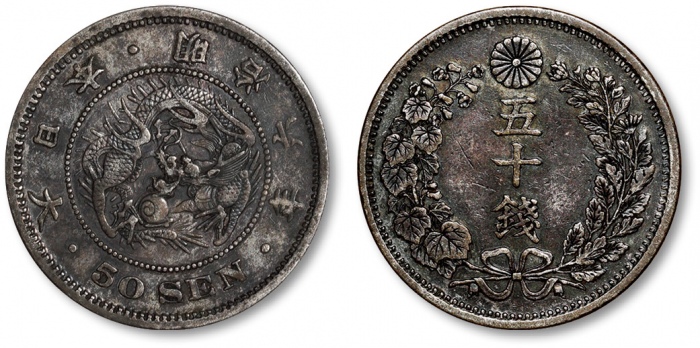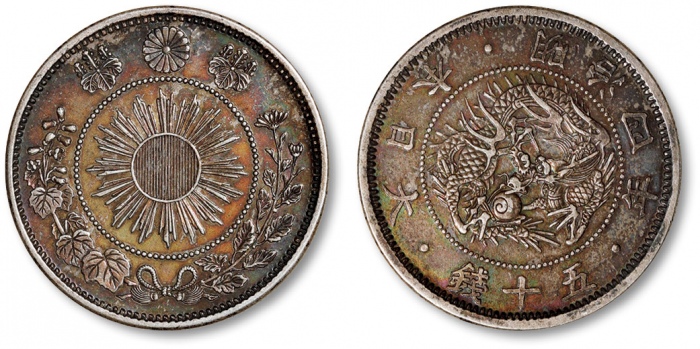 日本明治三年五十钱银币一枚,打制规范,图案清晰,包浆醇厚,极美品