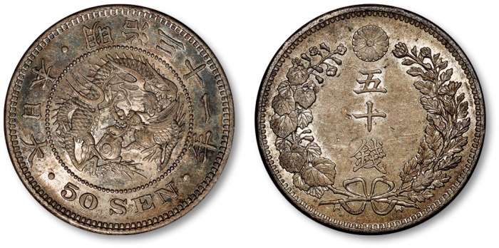日本明治三十一年五十钱银币一枚,打制深峻规范,图案挺拔饱满,底版平整,深灰色包浆,底光丝滑闪亮,状态上佳,完全未使用品
