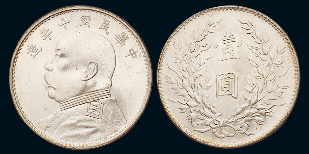 第200408号:1921年民国十年袁像银币壹圆 PCGS XF45,五彩包浆,图文压印深竣清晰。估价:2500--4000