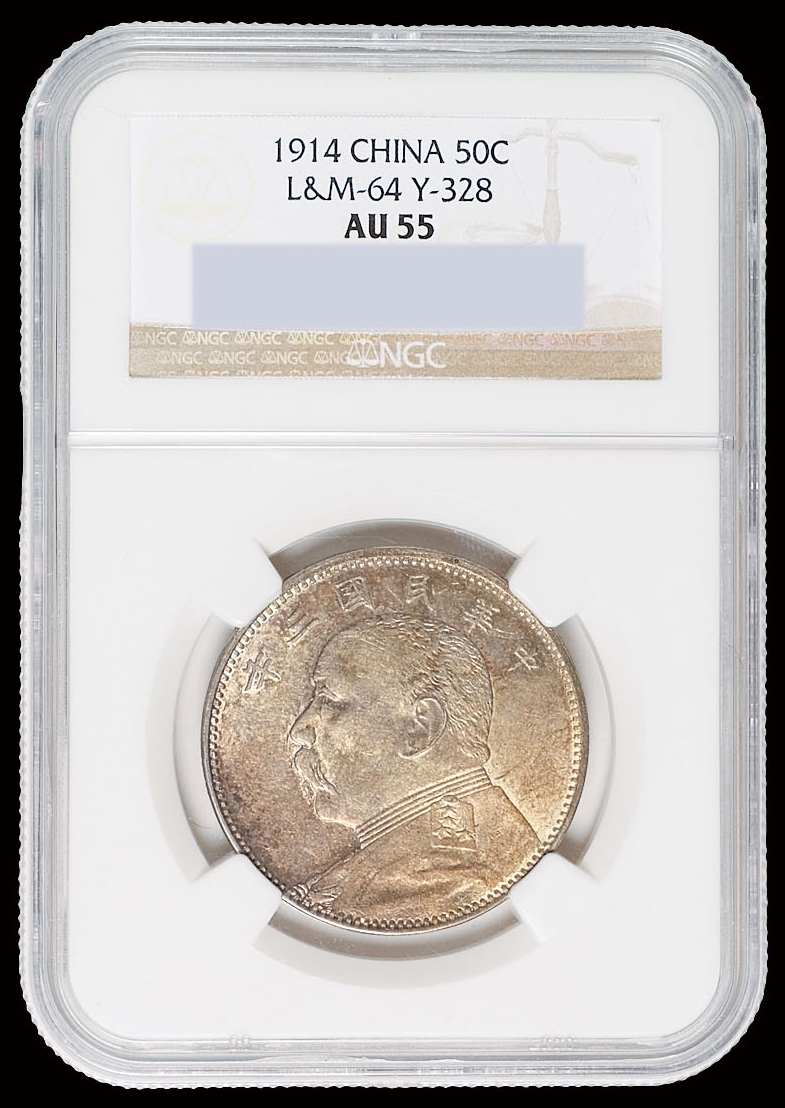 第200405号:1914年民国三年袁像银币壹圆 PCGS AU55,原味状态,深打带光,包浆浓郁,味道一流。 估价:2500--4000