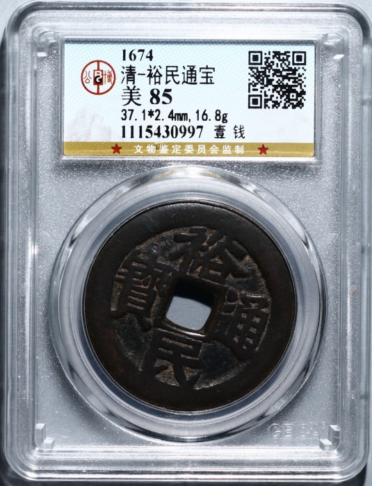 第200399号:清代 裕民通宝 壹钱 GBCA 美85,清初靖南王耿精忠,据闽中时(1764~1676年)铸,工艺较精,面文“裕民通宝”楷书对读,有光背和背“一分”、“壹钱”、“浙一钱”等。拍品为裕民通宝(背壹钱),字口清晰,传世老包浆,极美品。估价:3000--6000 ...